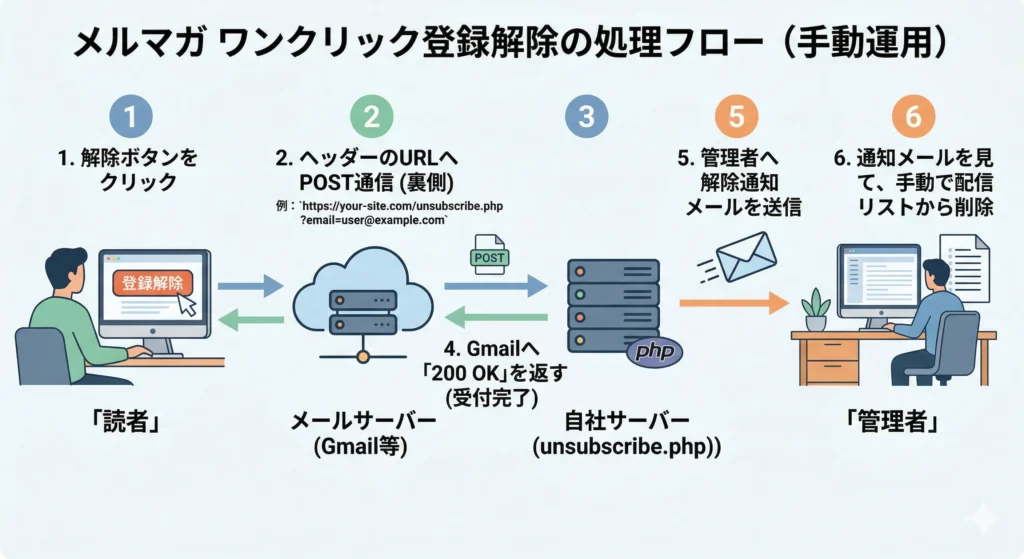 この記事では、**「解除リクエストをプログラムで受け取り、管理者宛に通知メールを飛ばして、手動でリストから削除する」**という実務に即した運用フローを構築するための仕組みと実装方法を解説します。