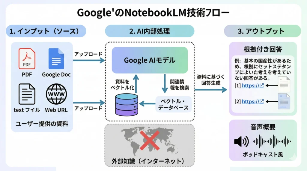 以下の図解は、NotebookLMの技術的なフローを示しています。